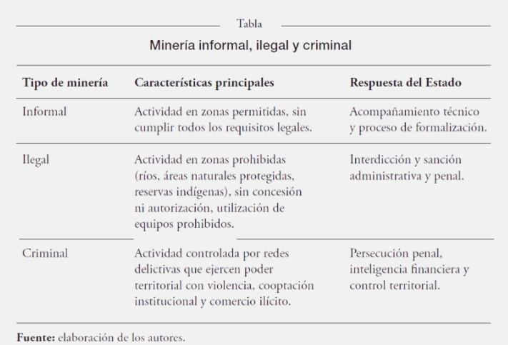 Resulta insuficiente mantener una clasificación binaria entre minería informal y minería ilegal. La realidad actual exige una tipología más precisa que permita distinguir entre tres categorías operativas: minería informal, minería ilegal y minería criminal. Esta diferenciación no solo responde a criterios geográficos y legales, sino también a la naturaleza de los actores involucrados, sus capacidades operativas y sus vínculos con estructuras delictivas.