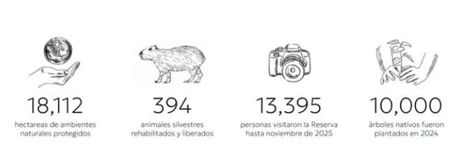 En resumen, la reserva representa la conservación de ambientes y sus interacciones, la restauración con plantaciones de nativas, la reintroducción de animales en el refugio, el control de especies exóticas invasoras, la educación ambiental, entre otros.