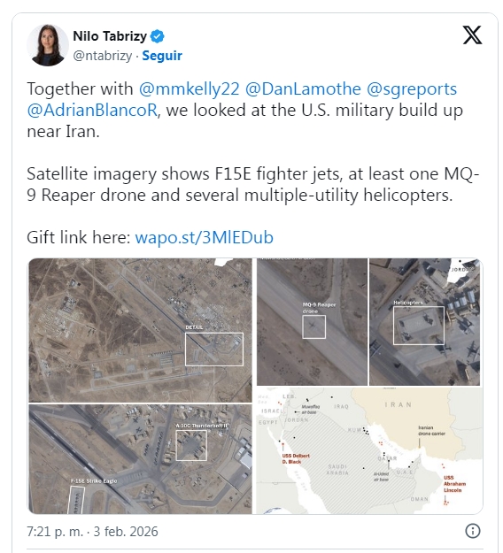 Según expertos, la incorporación de aeronaves de búsqueda y rescate sugiere que el Pentágono se prepara para escenarios en los que haga falta recuperar pilotos u operadores especiales en territorio hostil. Imágenes satelitales del lunes muestran al menos un dron MQ-9 Reaper y varios helicópteros multipropósito recién llegados a Muwaffaq Salti, un despliegue similar al que EE.UU. envió al Caribe semanas antes de la incursión que terminó con el secuestro del presidente Nicolás Maduro.
