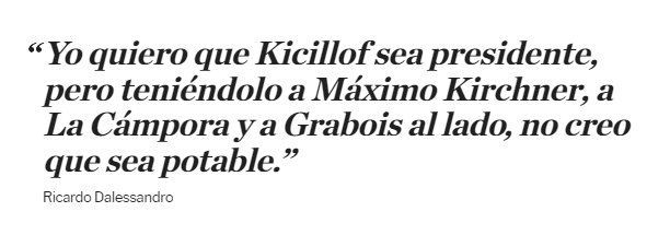 Algunos intendentes que trabajaron muy cerca del gobernador en los últimos meses salieron a hablar después de la elección del domingo. "Yo quiero que Kicillof sea presidente, pero teniéndolo a Máximo Kirchner, a La Cámpora y a Grabois al lado, no creo que sea potable", dijo el intendente de Salto, Ricardo Alessandro, un axelista de la primera hora.