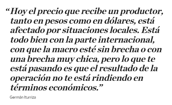 En el campo responden que esa cuenta está bien hecha y mal contada. Germán Iturriza, consultor y hombre escuchado en el sector, lo resumió con crudeza. Dijo que un productor puede mirar esos gráficos y reírse, no porque sean falsos sino porque muestran apenas una parte de la película. "Hoy el precio que recibe un productor, tanto en pesos como en dólares, está afectado por situaciones locales. Está todo bien con la parte internacional, con que la macro esté sin brecha o con una brecha muy chica, pero lo que te está pasando es que el resultado de la operación no te está rindiendo en términos económicos", explicó.
