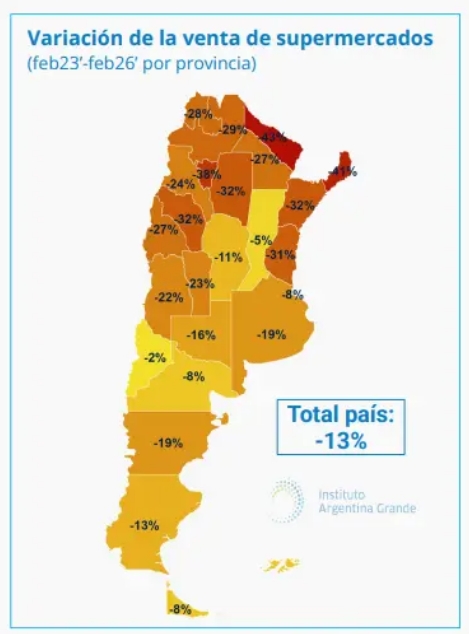 De este modo,las ventas en supermercados se ubicaron 11% por debajo de noviembre de 2023 (serie sin estacionalidad). La variación interanual en el total país fue de -13%, y si bien las bajas son generalizadas hay diferencias por regiones. Según detallaron desde el Instituto Argentina Grande (IAG) en el Noreste Argentino (NEA) la variación promedio fue de -36% y en el Noroeste (NOA) del -31%, en otras palabras, contra febrero de 2023 la compra en supermercados se contrajo un tercio (en términos reales). Por último, la Provincia de Buenos Aires (-19% contra 2023) evidenció una imagen heterogénea: en el Conurbano cayeron 22% en términos reales y en el resto de la PBA un 13%.