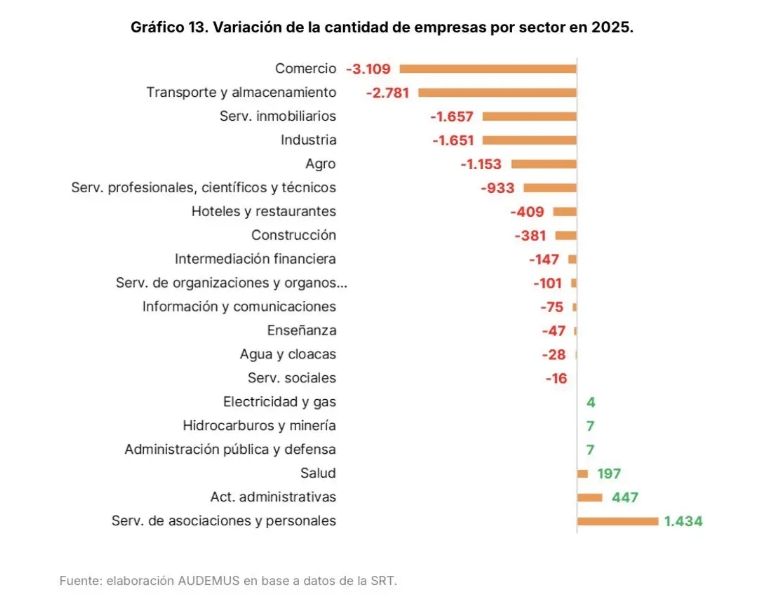 Según un informe de la consultora Audemus, la mayor cantidad de cierres se dio en Comercio (-3.109), seguido por Transporte y almacenamiento (-2.781), Servicios inmobiliarios (-1.657) e Industria manufacturera (-1.651). Estos sectores explicaron en conjunto casi el 90% de la destrucción neta de empresas durante 2025. No obstante, el Agro y la Intermediación financiera, dos de los sectores más dinámicos, también perdieron firmas (-1.153 y -147, respectivamente). El único sector que presentó una suba en la cantidad de empresas fue Hidrocarburos y minería (+7).