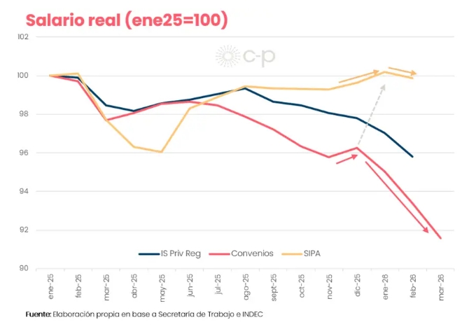 De esa manera, todos los indicadores salariales mostraron caídas reales, con distinta intensidad: los datos del Índice Privado Registrado (INDEC) que aproximan el salario horario, exhibieron un empeoramiento sistemático del salario real desde septiembre 2025. En ese sentido, el economista Federico Pastrana consideró en un informe reciente que "hace falta mucha desinflación para ver recuperaciones de salarios reales. Los datos de Convenios adelantan un empeoramiento que se verá reflejado en las próximas publicaciones de las mediciones oficiales", anticipó.