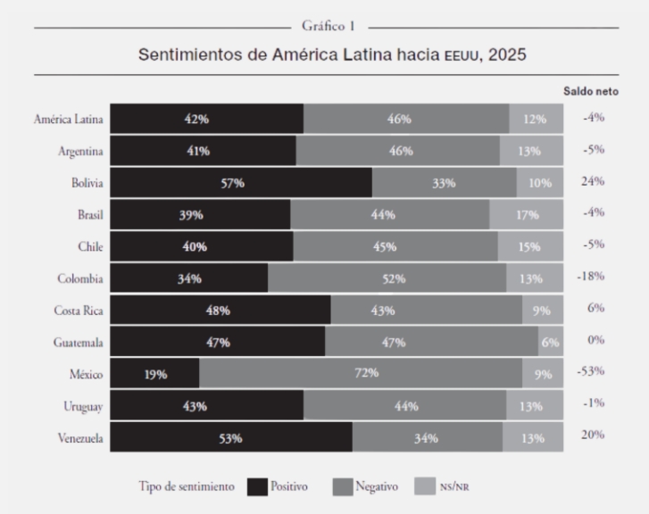 Nota: respuesta a la pregunta: «De las siguientes palabras, ¿cuál describe mejor sus sentimientos hacia EEUU?». Saldo neto = porcentaje de sentimientos positivos – porcentaje de sentimientos negativos. El saldo neto puede presentar un error de ±1% debido al redondeo de las cifras. Las barras pueden no sumar 100% debido al redondeo de las cifras. Fuente: FES, Nueva Sociedad, Grupo Diálogo y Paz y Latinobarómetro: «Encuesta sobre las relaciones entre América Latina y Europa», 2025.