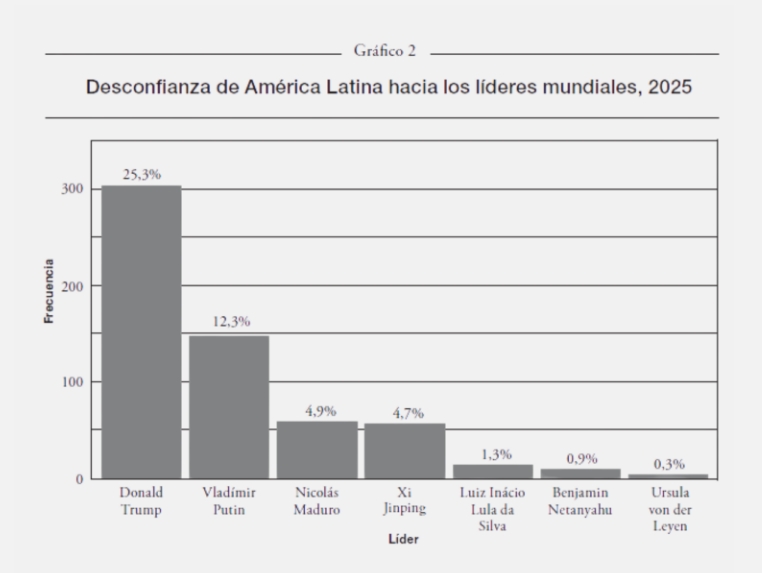 Nota: respuesta a la pregunta: «Dígame cuál es el líder mundial en el que usted confía menos». Fuente: FES, Nueva Sociedad, Grupo Diálogo y Paz y Latinobarómetro: «Encuesta sobre las relaciones entre América Latina y Europa», 2025.