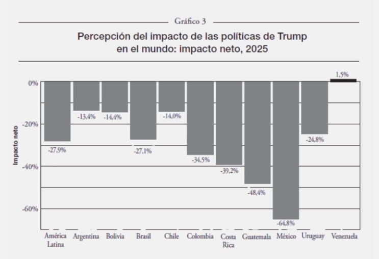 Las variaciones nacionales refuerzan esta interpretación. En países estratégicamente centrales para la política estadounidense, como México (-65%), Guatemala (-49%), Costa Rica (-40%) y Colombia (-35%), el rechazo a la política exterior del proyecto maga es particularmente intenso. Estos países no solo están más expuestos a las políticas de Trump; también son los que experimentan con mayor claridad la asimetría estructural de la relación interamericana. La desaprobación no nace de la distancia, sino de la cercanía forzada. En contraste, países como Argentina (-13%), Bolivia (-14%) y Chile (-14%) presentan balances negativos más moderados, lo que sugiere una relación no tan directamente atravesada por la coerción cotidiana. El caso de Venezuela, con un balance ligeramente positivo (+1,5%), no contradice el argumento: refleja más bien cómo el conflicto interno puede reconfigurar la percepción del actor externo, incluso cuando ese actor ejerce presión severa.