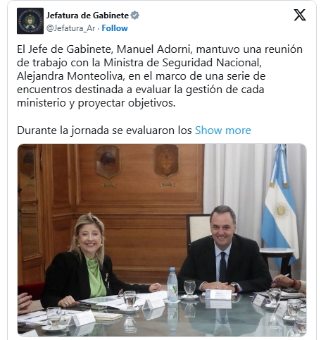 Monteoliva fue la primera funcionaria en reunirse con Manuel Adorni a pedido del Presidente, tal y como se resolvió la semana pasada en un encuentro entre Javier Milei y el Jefe de Gabinete en Olivos. Según se informó oficialmente, la ministra y el vocero evaluaron los resultados de la gestión de los últimos dos años y proyectaron los próximos, hasta el 2027, en base a cuatro ejes: la lucha contra el narcotráfico y el crimen organizado; el mantenimiento del orden público y la reducción del delito; la modernización del sistema penitenciario; y el fortalecimiento integral del sistema de seguridad.