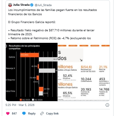 El dato confirma algo que los economistas venían anticipando: la mora de las familias empieza a impactar en el sistema financiero. La diputada kirchnerista Julia Strada fue una de las primeras en señalarlo públicamente. Según explicó, el banco registró pérdidas por segundo trimestre consecutivo por el aumento de los créditos que dejan de pagarse.