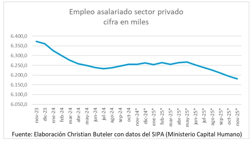 Entre junio y noviembre del último año, el empleo asalariado privado acumuló una pérdida de 88.000 puestos, impulsada principalmente por desvinculaciones en empresas medianas y grandes de la industria y el comercio.