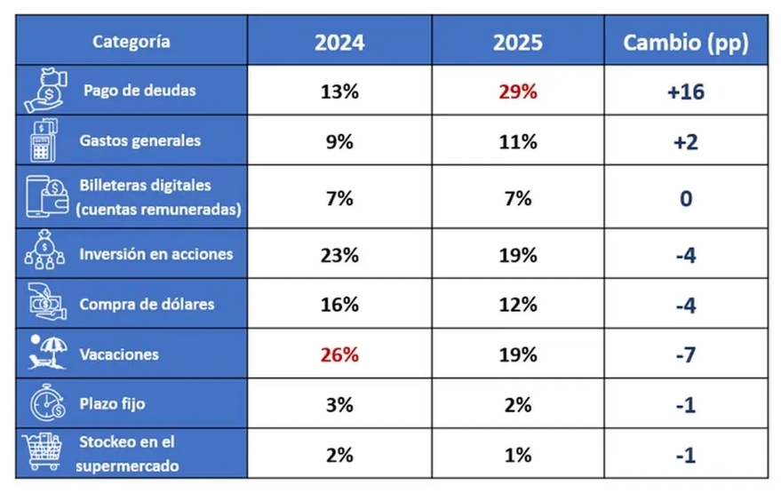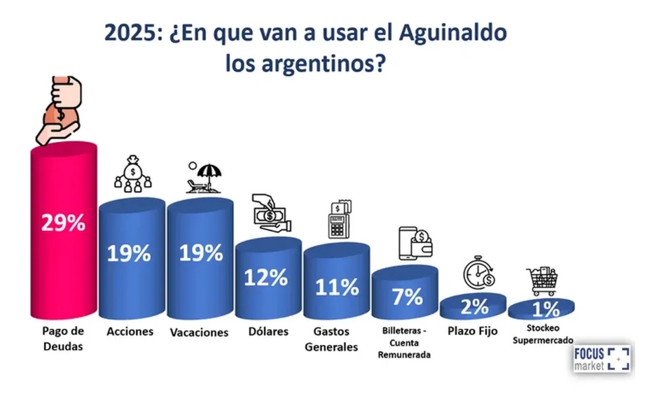 Con base en una muestra de 3.875 casos, Focus Market reveló que el porcentaje de personas que destinan el aguinaldo a pagar deudas se duplicó, pasando del 13% en 2024 al 29% en 2025. "El aguinaldo dejó de ser un 'extra' para convertirse en el parche que muchas familias de clase media usarán para cerrar el mes", explicó Damián Di Pace, director de Focus Market.