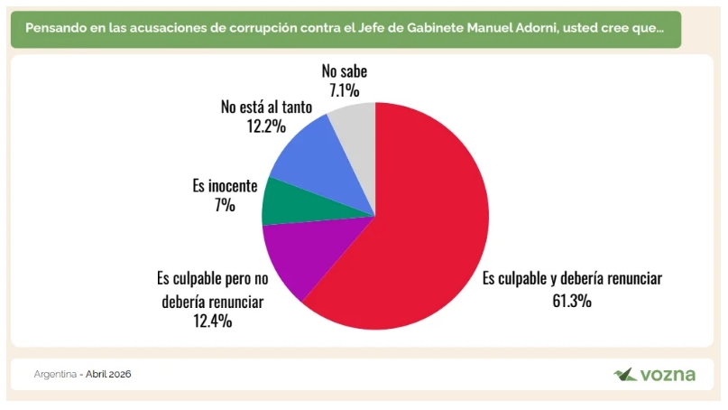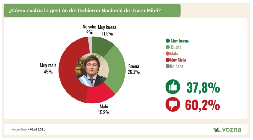 Según los datos de Vozna, la gestión descendió del 44,9% de aprobación en enero al 37,8%, en un contexto donde el rechazo ya no se limita a votantes opositores, sino que también alcanza a sectores que acompañaron al oficialismo en las elecciones.