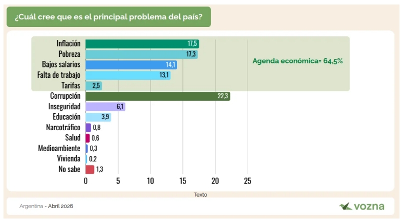Los problemas económicos concentran el 64,5% de las preocupaciones a nivel país. Inflación, pobreza, bajos salarios, falta de empleo y tarifas aparecen como los principales ejes.