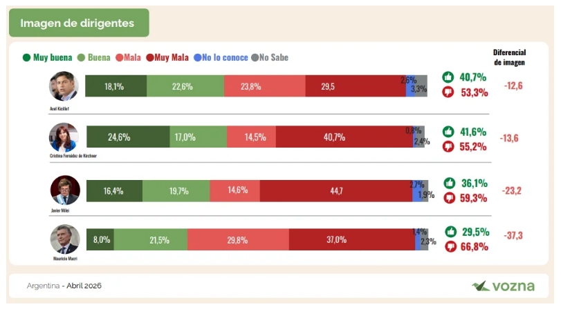En el plano político, los dirigentes peronistas Cristina Fernández de Kirchner y Axel Kicillof aparecen mejor posicionados que Javier Milei y Mauricio Macri, aunque ninguno logra capitalizar plenamente el descontento.
