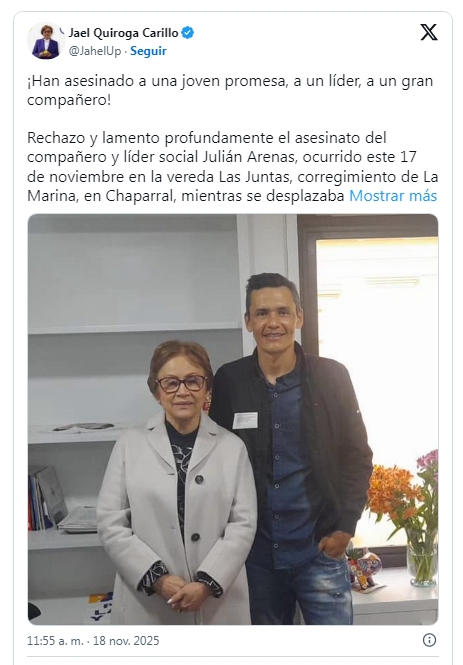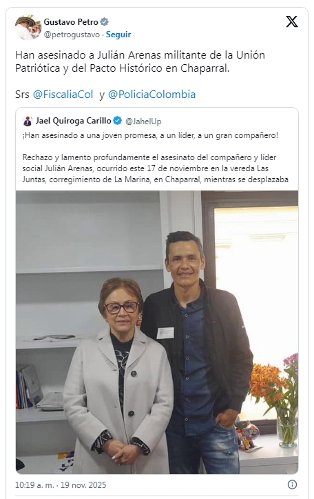 "Han asesinado a Julián Arenas, militante de la Unión Patriótica y del Pacto Histórico en Chaparral", expresó el mandatario, en respuesta a una declaración de repudio emitida por la senadora oficialista Jael Quiroga Carrillo. Arenas regresaba a su hogar el pasado 17 de noviembre cuando fue atacado con arma de fuego en la zona rural de La Marina, una región históricamente golpeada por la disputa territorial entre grupos armados.