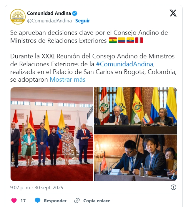 La agencia de noticias Xinhua anunció la semana pasada la decisión, adoptada durante la XXXI Reunión del Consejo Andino de Ministros de Relaciones Exteriores de la CAN, celebrada el pasado 1 de octubre en Bogotá y que fue aprobada por unanimidad.