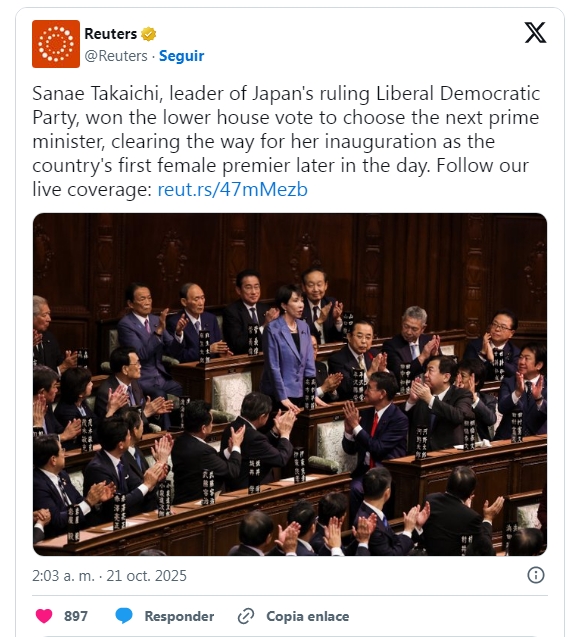 La elección de Takaichi, presidenta del PLD, como la primera ministra pone fin a un vacío político de tres meses y a las disputas internas que siguieron a la derrota electoral de su partido.