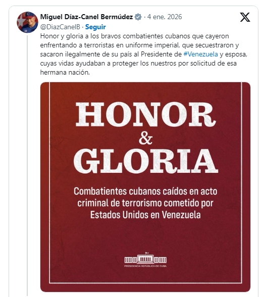 El presidente Miguel Díaz-Canel Bermúdez llamó "terroristas en uniforme imperial" a las Fuerzas Armadas de Estados Unidos y deseó "honor y gloria" a los compatriotas caídos.