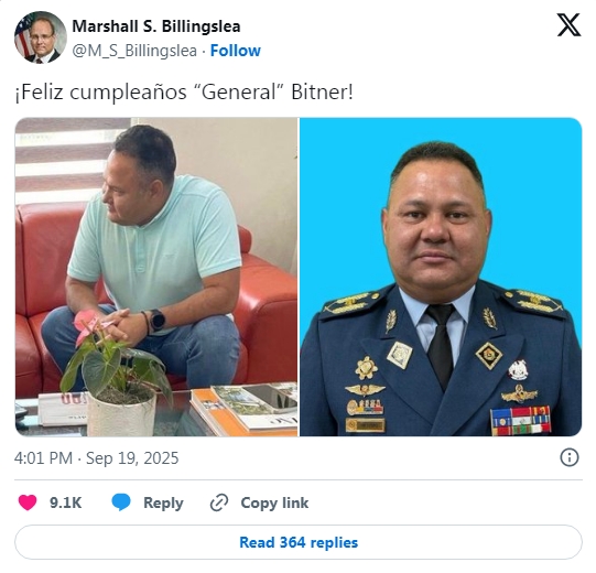 El exfuncionario republicano Marshall Billingslea, cercano al entorno de Trump y a la oposición venezolana en el exilio, publicó el 20 de septiembre un mensaje en la red X en el que felicitaba al general Villegas por su cumpleaños y difundía una fotografía suya tomada durante la reunión en República Dominicana. "Un héroe que pronto entenderá lo que es la libertad", escribió, en un mensaje que fue interpretado en Caracas como una provocación y reavivó rumores sobre una posible deserción del piloto.