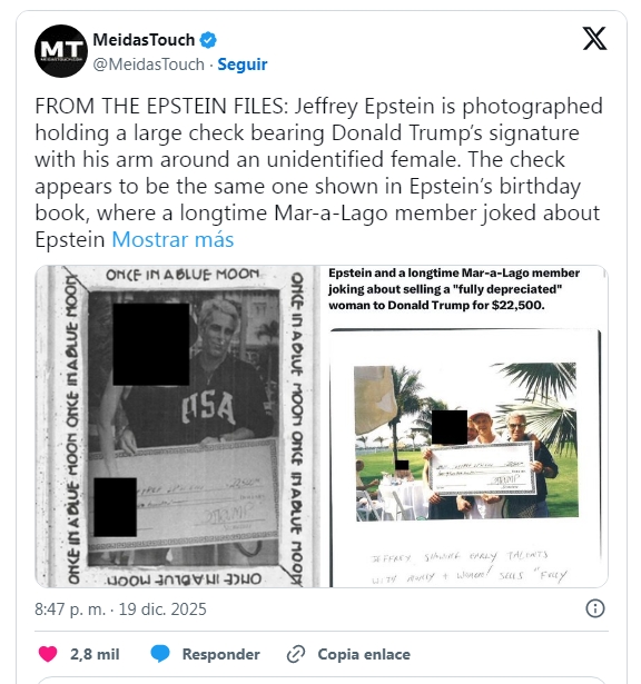 El cheque parece ser el mismo que aparece en un libro de cumpleaños de Epstein, donde un antiguo socio de Mar-a-Lago se refirió –aparentemente en broma– sobre la venta a Trump de una mujer "totalmente devaluada" por 22.500 dólares.