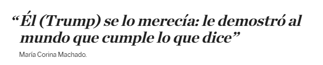 También afirmó que su movimiento obtendría "más del 90 % de los votos" en unas elecciones libres y justas. Sin embargo, Trump niega públicamente a respaldarla, al afirmar durante el fin de semana que Machado no cuenta con el apoyo suficiente dentro de Venezuela para liderar el país.