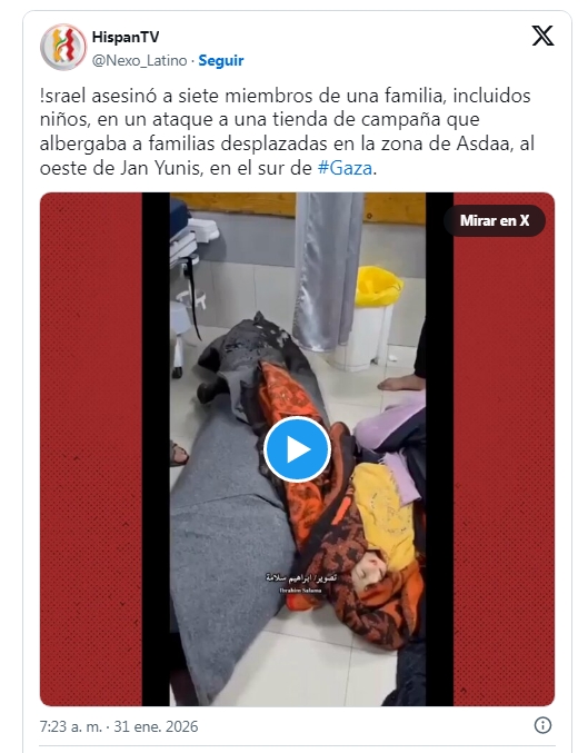En el sur de Gaza, siete palestinos murieron y otros resultaron heridos cuando una tienda de campaña que alojaba a la familia Abu Hudaid fue atacada en la zona de Asdaa, al noroeste de Jan Yunis.