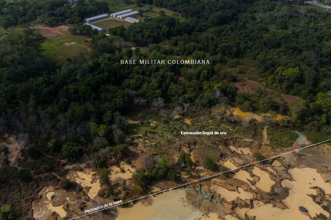 Las autoridades colombianas realizan ocasionalmente ataques aéreos y redadas en las minas que dan dinero al Clan. Pero los mineros de La Mandinga aparentemente no tienen de qué preocuparse, a pesar de que su explotación linda directamente con una base militar. Operan con tal impunidad que, cuando sobrevolamos la zona con un dron en febrero, vimos que los trabajadores habían traspasado el perímetro de la base y estaban extrayendo oro en terreno militar.
