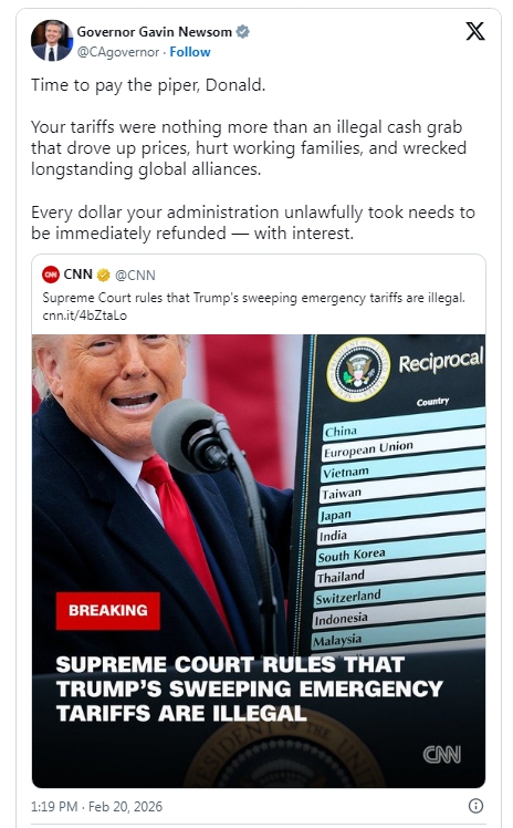 Pero además de quitarle una palanca clave a su intervencionismo internacional, la decisión de la Corte le da un formidable argumento a la oposición demócrata. Uno de los primeros en aprovecharlo fue el gobernador de California, Gavin Newsom, que está lanzando en la carrera presidencial. "Tiempo de pagar la cuenta, Donald", se burló el demócrata.