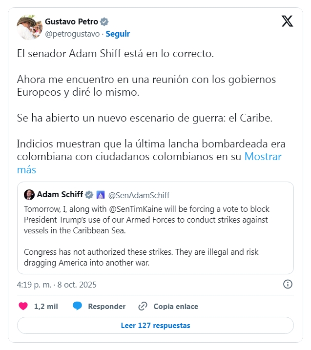 "Indicios muestran que la última lancha bombardeada era colombiana con ciudadanos colombianos en su interior. Espero que aparezcan sus familias y denuncien", escribió el mandatario en su cuenta de X, como comentario a una publicación del senador estadounidense Adam Shiff, en la que se anuncia que se introducirá una proposición en el Congreso para bloquear el uso de fuerzas militares de ese país contra embarcaciones en el Caribe.
