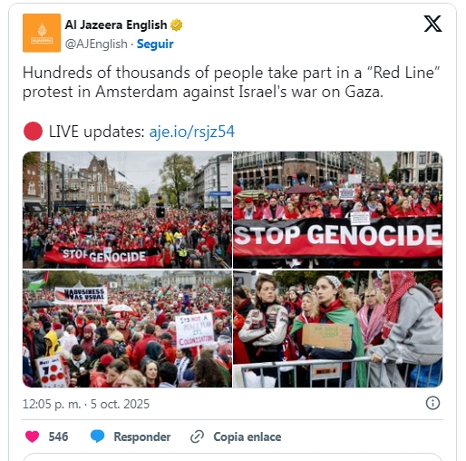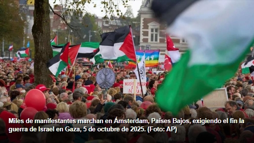 En los Países Bajos, unas 250 000 personas llenaron el domingo el centro de Ámsterdam (la capital). Enarbolando las banderas palestinas y vestidos de rojo, los activistas exigieron a su Gobierno una línea más dura contra Israel y el cese de las exportaciones de armas a este último.