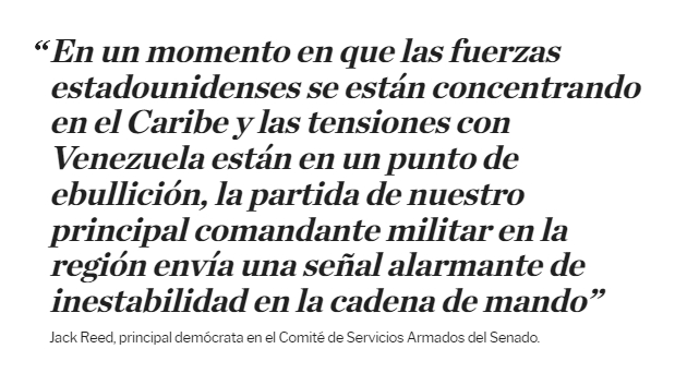 Por otro lado, Jack Reed, senador por Rhode Island, principal demócrata en el Comité de Servicios Armados del Senado, fue aún más mordaz en sus críticas. "En un momento en que las fuerzas estadounidenses se están concentrando en el Caribe y las tensiones con Venezuela están en un punto de ebullición, la partida de nuestro principal comandante militar en la región envía una señal alarmante de inestabilidad en la cadena de mando", dijo Reed en un comunicado.