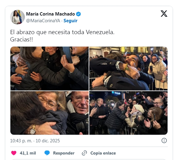 Minutos después, la dirigente salió de su hotel para saludar a la militancia. Luego, compartió las imágenes en su cuenta de X: "El abrazo que necesita toda Venezuela".