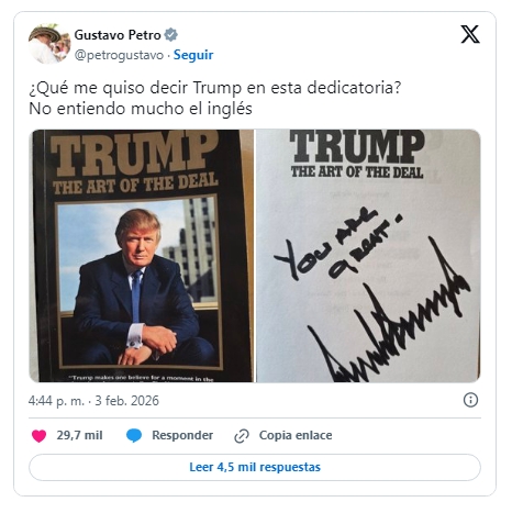 "Gustavo. Un gran honor. Amo a Colombia", decía la tarjeta con el membrete de la Casa Blanca que acompaña una foto de ambos sonrientes y que fue publicada en X por el presidente Petro. Petro publicó además otra foto del libro Trump, the art of the deal que el presidente estadounidense le firmó con el mensaje: "Eres genial". "¿Qué me quiso decir Trump en esta dedicatoria? No entiendo mucho el inglés", señaló Petro en el mensaje que acompaña la segunda foto.