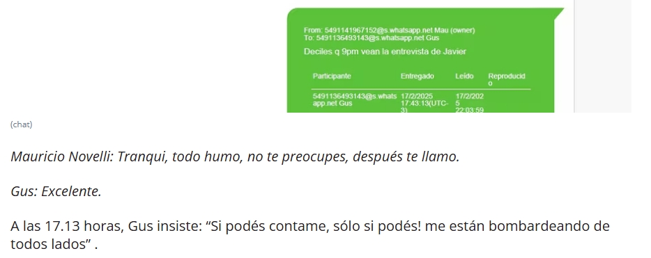 Ya desde el 16 de febrero "Gus" le mandaba a Novelli recortes de la televisión y otros medios donde se hablaba de $LIBRA y de él. Le envía una foto, donde se lo ve junto a Davis y Peh. Este es el diálogo, un día después, donde Novelli muestra que estaba al tanto de la estrategia presidencial: