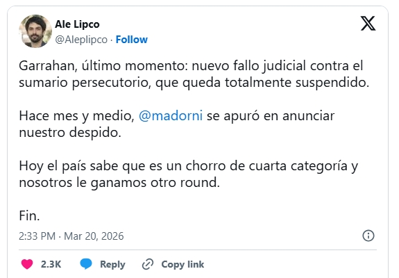 El dirigente recordó que a principios de febrero fue el jefe de Gabinete, Manuel Adorni, quien anunció él mismo el despido de los gremialistas, por llevar adelante una manifestación para "cobrar por días no trabajados". "La era de la izquierda intentando vivir a costa de los argentinos de bien está llegando a su fin. Fin", había escrito Adorni en sus redes sociales.