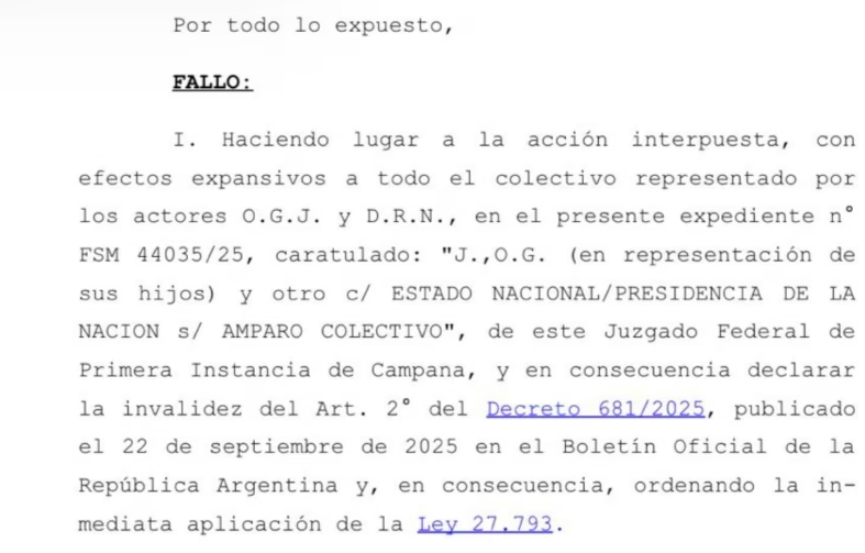 El juez hizo lugar a un amparo colectivo presentado por familias, organizaciones y profesionales del sector, y declara inválido el artículo 2° del Decreto 681/2025, con el que el Gobierno había frenado la aplicación de la ley sancionada en julio. La sentencia sostiene que "nada impide al Estado cumplir con la ley y financiarla como ya hizo en otros casos", desestimando los riesgos fiscales que argumentó la Casa Rosada.