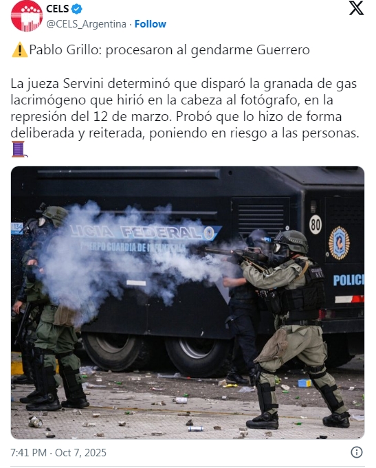 En el caso de Guerrero, Servini dio por probado que "no hay dudas de que Guerrero fue el autor del disparo de la granada de gas lacrimógeno que hirió de gravedad a Pablo Grillo, que lo hizo de forma horizontal y antirreglamentaria, a sabiendas de que con su accionar podía poner en riesgo la integridad física de cualquiera de las personas que se hallaban frente a él, o incluso la vida'", informó el CELS tras conocerse la decisión.