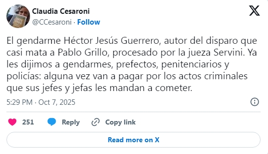 En el caso de Guerrero, Servini dio por probado que "no hay dudas de que Guerrero fue el autor del disparo de la granada de gas lacrimógeno que hirió de gravedad a Pablo Grillo, que lo hizo de forma horizontal y antirreglamentaria, a sabiendas de que con su accionar podía poner en riesgo la integridad física de cualquiera de las personas que se hallaban frente a él, o incluso la vida'", informó el CELS tras conocerse la decisión.