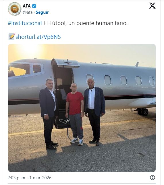 Con un texto titulado "El fútbol como puente", la AFA confirmó la excarcelación y agradeció tanto al Gobierno de Delcy Rodríguez como a la Federación Venezolana de Fútbol por la intervención.