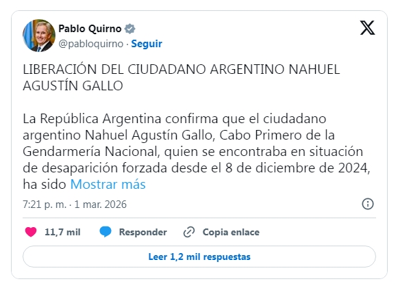 El Gobierno dio una versión oficial de la liberación de Gallo. "La República Argentina confirma que el ciudadano argentino Nahuel Agustín Gallo, Cabo Primero de la Gendarmería Nacional, quien se encontraba en situación de desaparición forzada desde el 8 de diciembre de 2024, ha sido liberado y ya se encuentra fuera de la República Bolivariana de Venezuela", expresó el canciller Pablo Quirno en sus redes sociales.