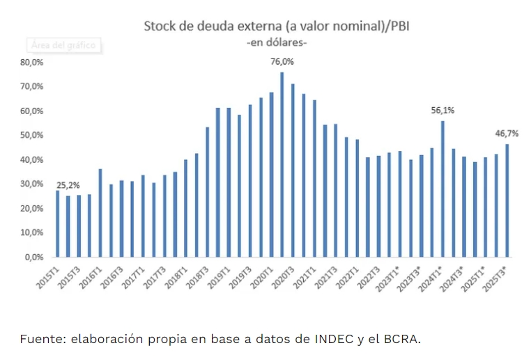 La deuda externa representó el 46,7% del Producto Bruto Interno (PBI) durante el tercer trimestre de 2025. Se trató del valor más alto desde el primer trimestre del gobierno de Javier Milei.