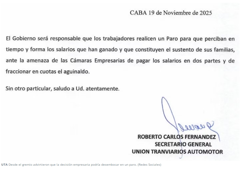 En ese escenario, las patronales adelantaron que el SAC se pagará en seis cuotas, mientras que los sueldos se dividirán en dos tramos. La UTA ya anticipó que, de mantenerse este esquema, avanzará con medidas de fuerza.
