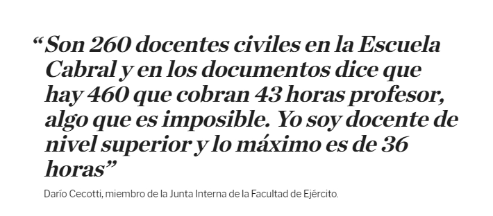 Cecotti detalló respecto de la denuncia que "son 260 docentes civiles en la Escuela Cabral y en los documentos dice que hay 460 militares que cobran 43 horas profesor cada uno, algo que es imposible. Yo soy docente de nivel superior y lo máximo que puedo hacer son 36 horas".