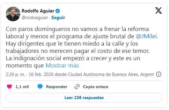 "Con paros domingueros no vamos a frenar la reforma laboral y menos el programa de ajuste brutal de @JMilei. Hay dirigentes que le tienen miedo a la calle y los trabajadores no merecen pagar el costo de ese temor", escribió el dirigente estatal.