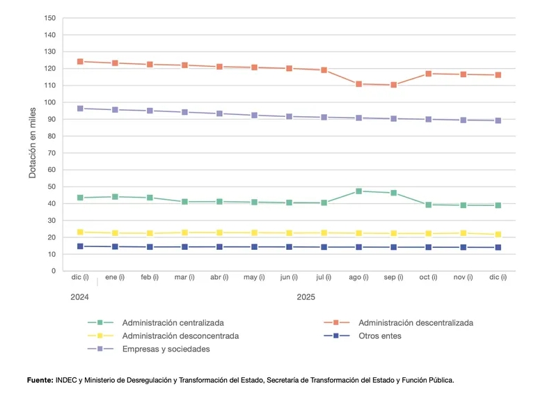 En tanto, las empresas y sociedades del Estado contabilizaron 89.184 trabajadores, con una reducción del 7,4% en comparación con diciembre de 2024.