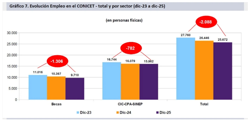El CONICET concentró más de un tercio de la reducción total. En ese organismo se registraron 2.088 bajas, de las cuales 782 corresponden a cargos de planta y 1.306 a becas de formación de posgrado.