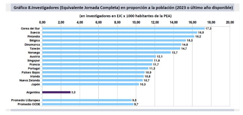 De acuerdo con el estudio, la Argentina cuenta con aproximadamente tres investigadores cada mil personas de la población económicamente activa. En los países con mayor desarrollo científico, esa relación se ubica en torno a diez por cada mil.