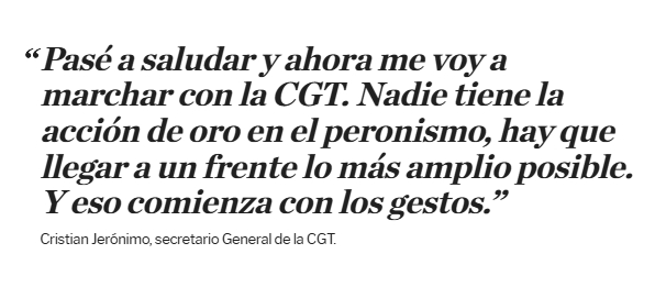 "Pasé a saludar y ahora me voy a marchar con la CGT. Nadie tiene la acción de oro en el peronismo, hay que llegar a un frente lo más amplio posible. Y eso comienza con los gestos", dijo contundente Jerónimo.