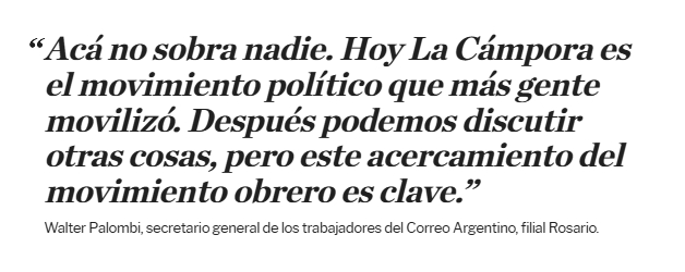 "Acá no sobra nadie, no hay que demonizar al kirchnerismo y además la columna de La Cámpora fue el movimiento político que más movilizó. El sindicalismo tiene una deuda con la sociedad por aquello de "yo me borro" de Casildo Herreras, pero también hay que decir que el setenta por ciento de los desaparecidos fueron delegados y dirigentes gremiales", afirmó a LPO Walter Palombi, secretario general de los trabajadores del Correo Argentino, filial Rosario.