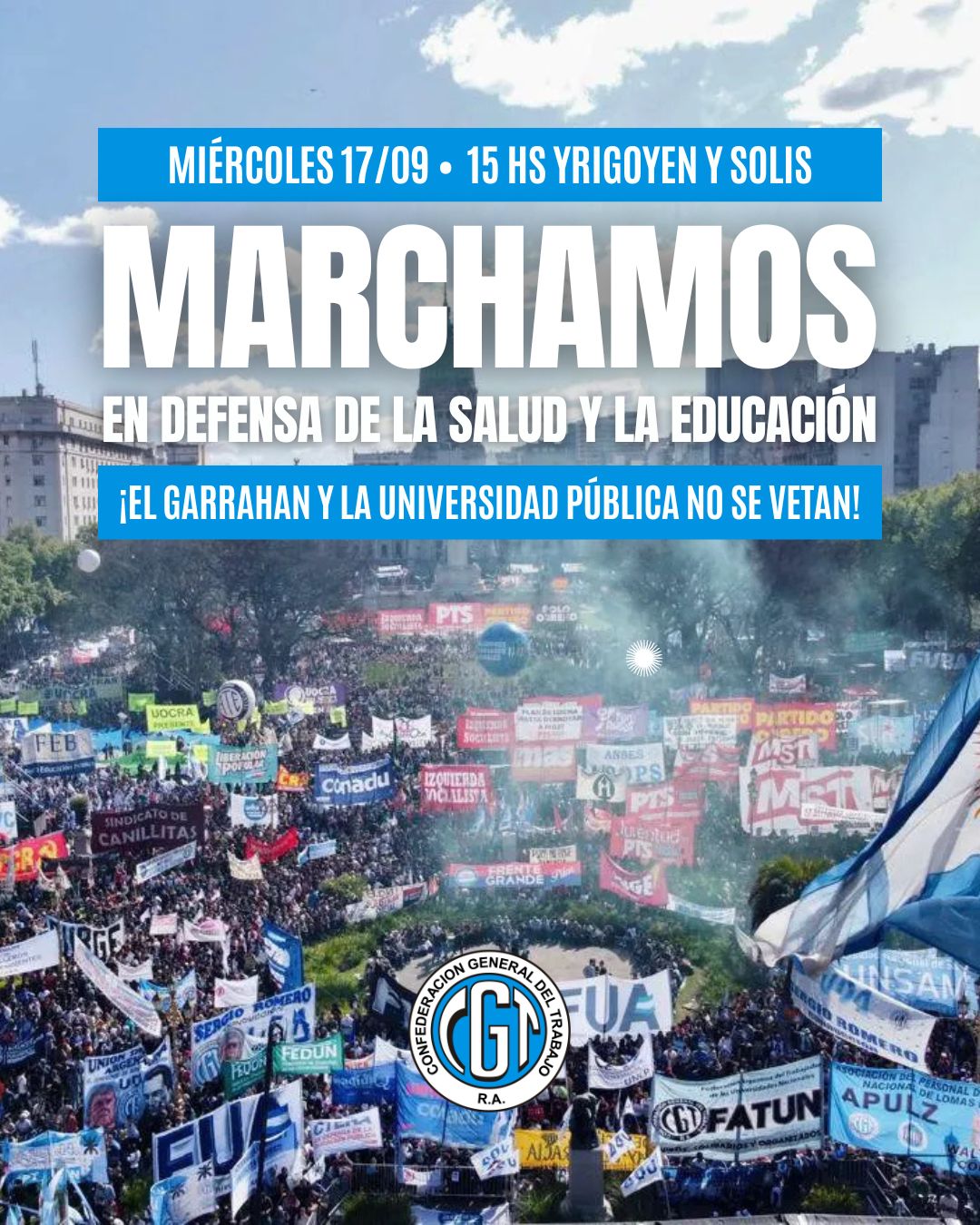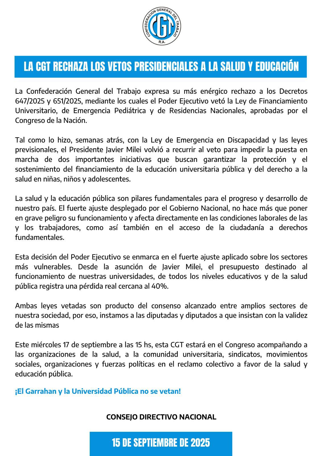 Este lunes, la conducción de la CGT anunció que también se sumará y hace minutos, al caer la noche, difundió un comunicado oficial donde expresa "su más enérgico rechazo a los Decretos 647/225 y 651/2025", con los cuales Milei vetó las dos leyes, y confirmó que movilizará a las 16 horas del miércoles.